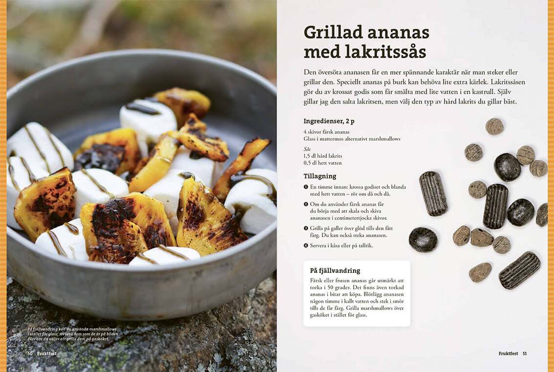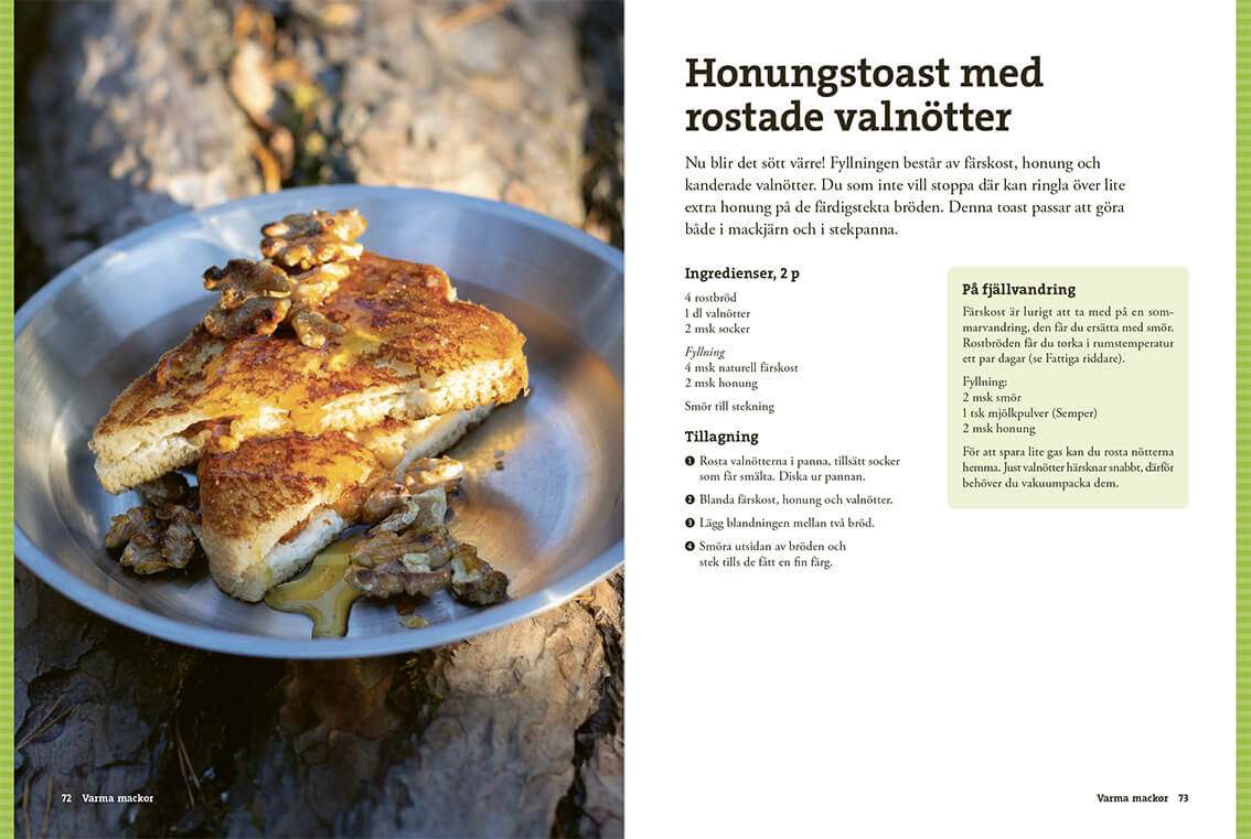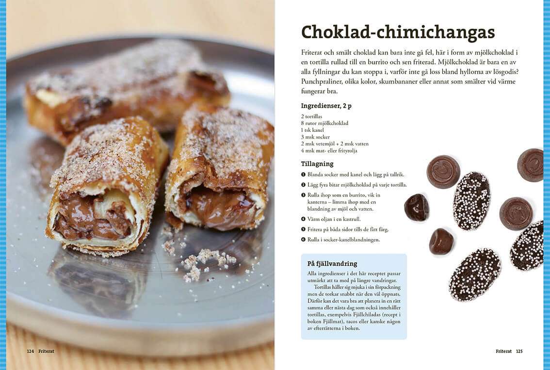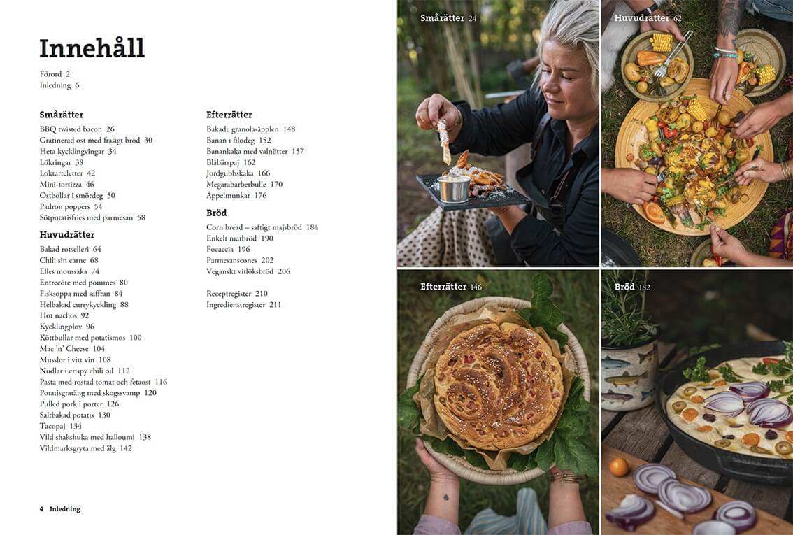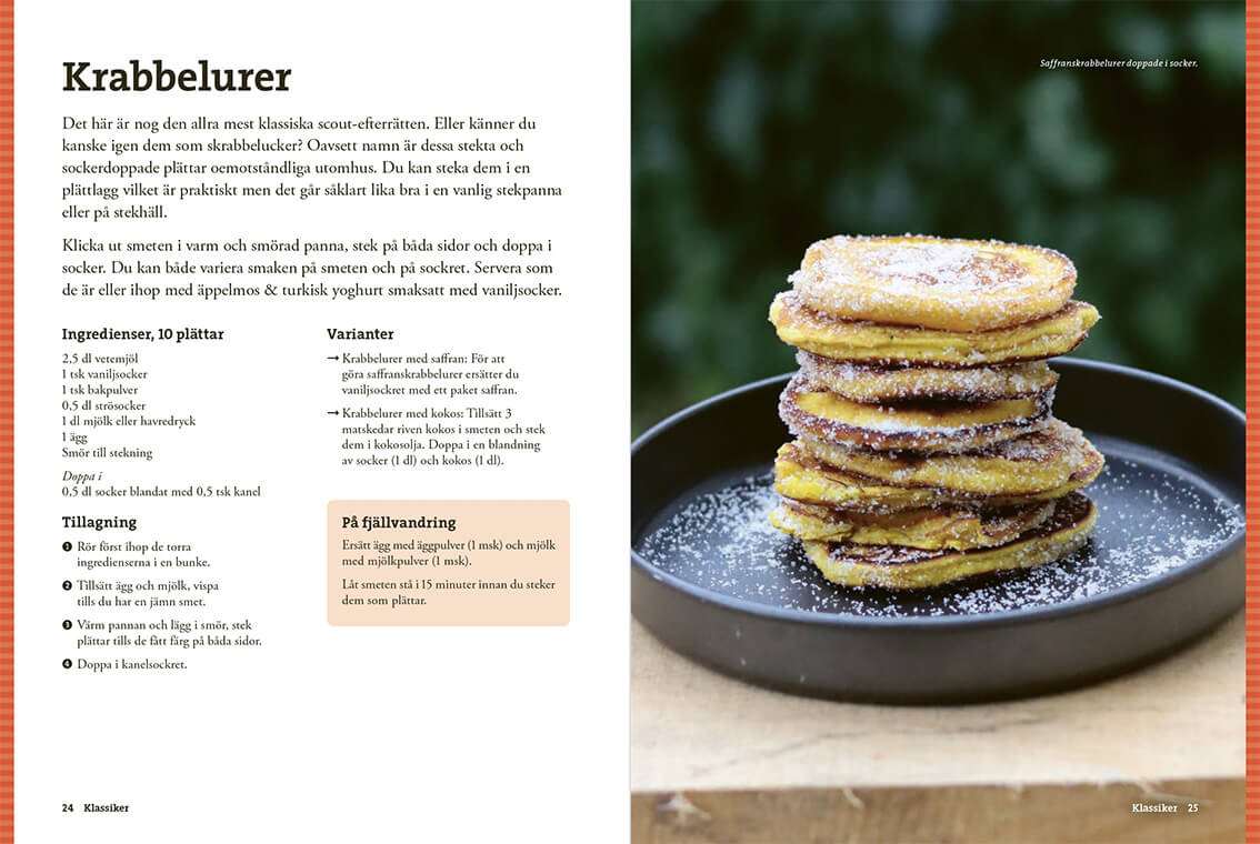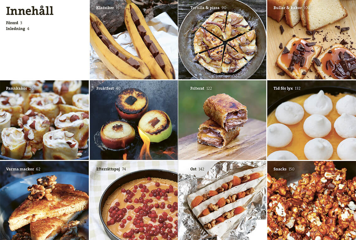 Här samlas klassiker som hotam totam, krabbelurer och hajkbanan, men också mer oväntade godsaker som inbakad äppelpaj och tiramisu. Med fokus på Efterrätt på tur visar boken hur du enkelt kan avsluta dagen ute med något riktigt gott.